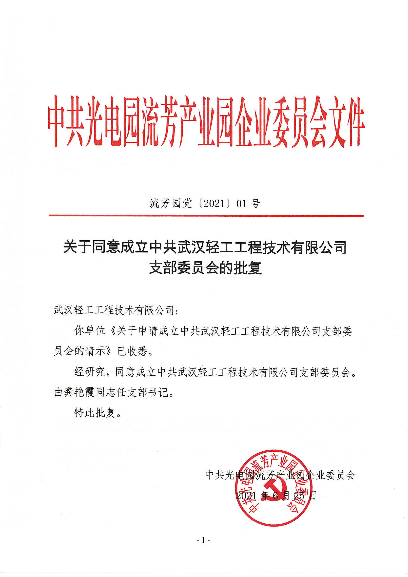 2021年6月30日下午2點(diǎn),中共光電園流芳產(chǎn)業(yè)園企業(yè)委員會黨辦書記江峰、黨辦委員李偉、黨辦專員李曉葉一行三人到我公司宣布了關(guān)于同意成立中共武漢輕工工程技術(shù)有限公司支部委員會的決定。